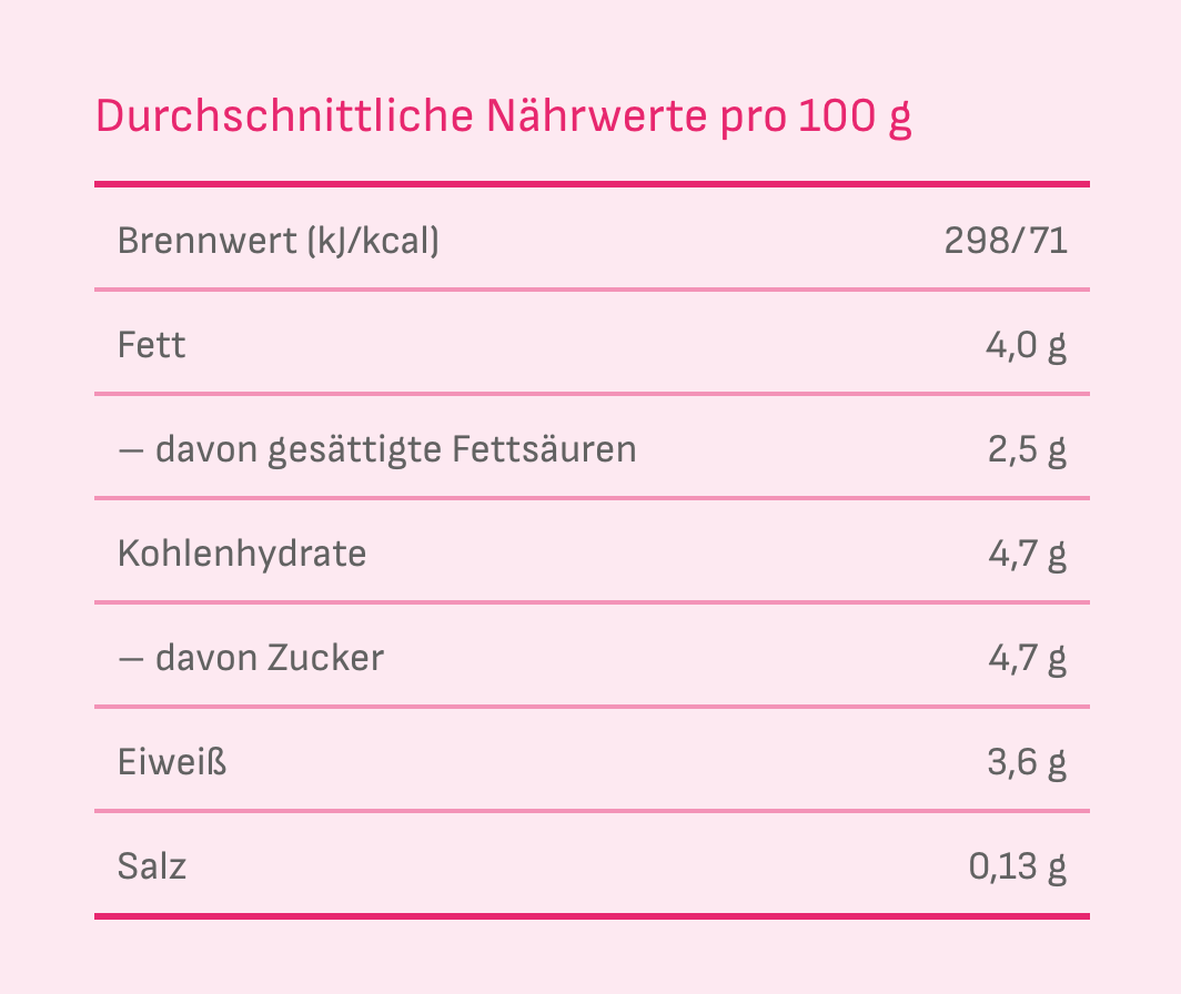 Entweder ihr holt euch unsere komplett unbehandelte Frischmilch aus einem unserer Automaten oder ihr greift zu unserer frischen Vollmilch im TetraPak. Diese wird nur ganz kurz auf 70°C erwärmt, damit alle wichtigen Milchbestandteile erhalten bleiben. Genuss pur.